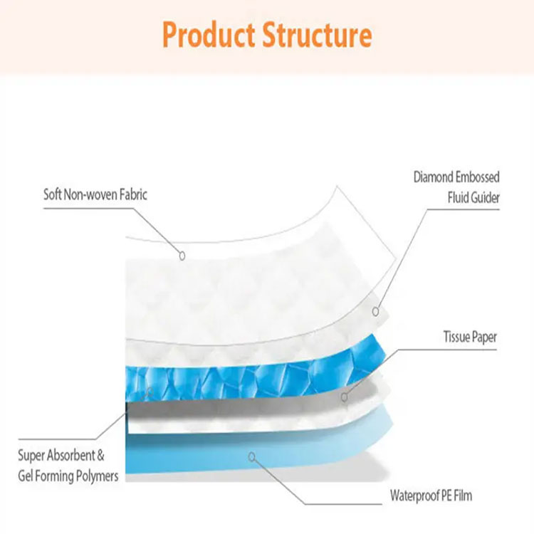 خمیر چوب طبیعی با کیفیت بالا، نرم و لطیف در لمس، مراقبت از پوست شکننده است. خمیر پرز، پارچه نبافته، رزین جذب پلیمری فیلم PE.